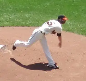 When pitching, Lincecum would start with his back slightly to the plate, his left leg raised, and his glove held over his head. Then, he would take a step of about seven feet forward, maneuvering his hips over the place his left foot was now planted as he released the ball. This helped him to generate high velocity despite his slight build. The power behind the throws was generated not just from the arm, but also from the long stride and the hip muscles.[6] Sportswriters Bob Nightengale and Robert Falkoff both thought that Lincecum was a similar pitcher to Roy Oswalt.[146][147]