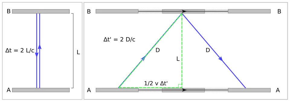 Right: Events according to an observer watching as the mirror setup moves to the right: bottom mirror A when signal is generated at time t'=0, top mirror B when signal gets reflected at time t'=D/c, bottom mirror A when signal returns at time t'=2D/c[14]