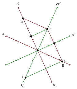 In the Minkowski diagram from the first image on the right, clock C resting in inertial frame S′ meets clock A at d and clock B at f (both resting in S). All three clocks simultaneously start to tick in S. The worldline of A is the ct-axis, the worldline of B intersecting f is parallel to the ct-axis, and the worldline of C is the ct′-axis. All events simultaneous with d in S are on the x-axis, in S′ on the x′-axis.