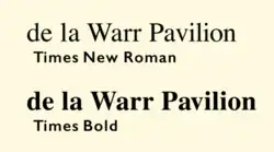 Rather than creating a companion boldface with letterforms similar to the roman style, Times New Roman's bold has a different character, with a more condensed and more upright effect caused by making the horizontal parts of curves consistently the thinnest lines of each letter, and making the top serifs of letters like 'd' purely horizontal.[30] This effect is not found in sixteenth-century typefaces (which, in any case, did not have bold versions); it is most associated with the Didone, or "modern" type of the early nineteenth century (and with the more recent 'Ionic' styles of type influenced by it that were offered by Linotype, discussed below).[20][31][32][33][34] Some commentators have found 'Times bold' unsatisfactory and too condensed, such as Walter Tracy.[29]