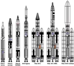 ![]() The Titan rocket family, from left to right: Titan I (ICBM), II (ICBM), II GLV (manned), IIIB, IIIC, IIIM (manned), IIIE | |