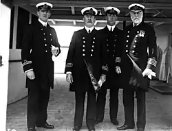 - Ewan Stewart as First Officer William Murdoch,[20] the officer in charge of the bridge when the Titanic struck an iceberg. During a rush for the lifeboats, Murdoch shoots Tommy Ryan, as well as another passenger, in a momentary panic, and then commits suicide by shooting himself in the head. When Murdoch's nephew Scott saw the film, he objected to his uncle's portrayal, seeing it as damaging to Murdoch's heroic reputation.[26] A few months later, Fox vice president Scott Neeson went to Dalbeattie, Scotland, where Murdoch lived, to deliver a personal apology, and also presented a £5000 donation to Dalbeattie High School to boost the school's William Murdoch Memorial Prize.[27] Cameron apologized on the DVD commentary, but stated that there were officers who fired gunshots to enforce the "women and children first" policy.[28] According to Cameron, his depiction of Murdoch is that of an "honorable man", not of a man "gone bad" or of a "cowardly murderer". He added, "I'm not sure you'd find that same sense of responsibility and total devotion to duty today. This guy had half of his lifeboats launched before his counterpart on the port side had even launched one. That says something about character and heroism."[29]