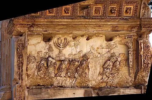 Upon his arrival in Rome in 71, Titus was awarded a triumph.[46] Accompanied by Vespasian and Domitian, Titus rode into the city, enthusiastically saluted by the Roman populace and preceded by a lavish parade containing treasures and captives from the war. Josephus describes a procession with large amounts of gold and silver carried along the route, followed by elaborate re-enactments of the war, Jewish prisoners and finally the treasures taken from the Temple of Jerusalem, including the Menorah and the Pentateuch.[47] Simon Bar Giora was executed in the Forum, and the procession closed with religious sacrifices at the Temple of Jupiter.[48] The triumphal Arch of Titus, which stands at one entrance to the Forum, memorialises the victory of Titus.
