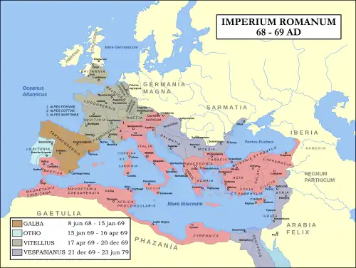 A map of the Roman Empire during the Year of the Four Emperors (AD 69). Blue areas indicate provinces loyal to Vespasian and Gaius Licinius Mucianus.
