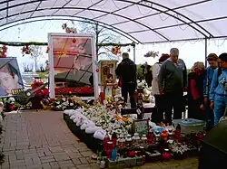 Proeski's body arrived at midnight in Skopje by helicopter of the Macedonian Army, and was transported by car to his home town of Kruševo. Grieving citizens gathered to pay their last respects at the airport and also in Macedonia Square. The Embassy of the United States of America, the USAID and the Diplomatic mission of the European Union published official statements on Proeski's death.[13][14][15] 17 October was declared a national day of mourning in Macedonia.[1] The three days following his death were pronounced days of mourning in Kruševo.[16]