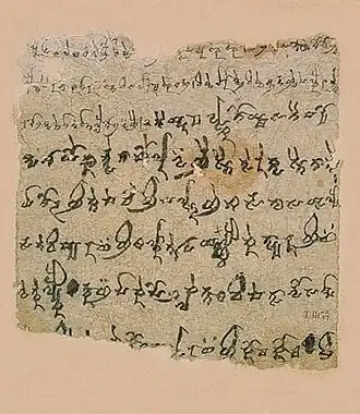 Most of attested Tocharian was written in the Tocharian alphabet, a derivative of the Brahmi alphabetic syllabary (abugida) also referred to as North Turkestan Brahmi or slanting Brahmi. However a smaller amount was written in the Manichaean script in which Manichaean texts were recorded.[36][37] It soon became apparent that a large proportion of the manuscripts were translations of known Buddhist works in Sanskrit and some of them were even bilingual, facilitating decipherment of the new language. Besides the Buddhist and Manichaean religious texts, there were also monastery correspondence and accounts, commercial documents, caravan permits, medical and magical texts, and one love poem.