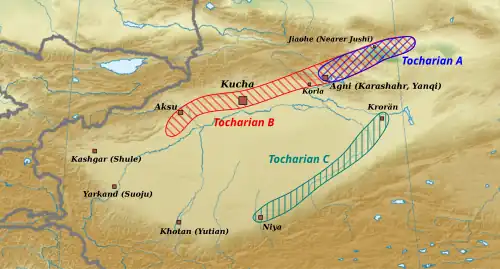 - Tocharian B (Kuchean or West Tocharian) of Kucha and Tocharian A sites.