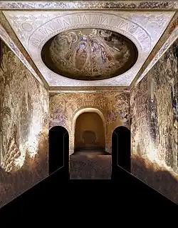 The Kizil Caves lie 65 km west of Kucha, and contain over 236 Buddhist temples. Their murals date from the 3rd to the 8th century.[92] Many of these murals were removed by Albert von Le Coq and other European archaeologists in the early 20th century, and are now held in European museums, but others remain in their original locations.[93]