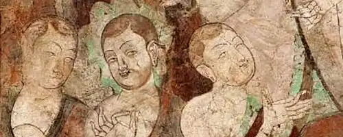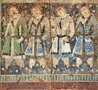 In the Kizil Caves appear portraits of Royal families, composed of the King, Queen and young Prince. They are accompanied by monks, and men in caftan.[1] According to Historian of Art Benjamin Rowland, these portraits show "that the Tocharians were European rather than Mongol in appearance, with light complexions, blue eyes, and blond or reddish hair, and the costumes of the knights and their ladies have haunting suggestions of the chivalric age of the West".[101]
