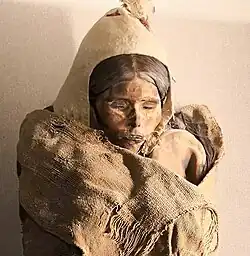 It is unknown whether the mummies are connected with the frescoes painted at Tocharian sites more than two millennia later, which also depict some figures with light hair color. A genetic study of remains from the oldest layer of the Xiaohe Cemetery found that the maternal lineages were a mixture of east and west Eurasian types, while all the paternal lineages were of west Eurasian type.[59] A genomic study published in 2021 found that while contemporaneous populations in Dzungaria to the north had Afanasievo ancestry, the Tarim mummies were unrelated to Afanasievo populations and instead were an isolated local population of Ancient North Eurasian ancestry.[60]