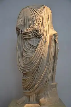 The most complex togas appear on high-quality portrait busts and imperial reliefs of the mid-to-late Empire, probably reserved for emperors and the highest civil officials. The so-called "banded" or "stacked" toga (Latinised as toga contabulata) appeared in the late 2nd century AD and was distinguished by its broad, smooth, slab-like panels or swathes of pleated material, more or less correspondent with umbo, sinus and balteus, or applied over the same. On statuary, one swathe of fabric rises from low between the legs, and is laid over the left shoulder; another more or less follows the upper edge of the sinus; yet another follows the lower edge of a more-or-less vestigial balteus then descends to the upper shin. As in other forms, the sinus itself is hung over the crook of the right arm.[104] If its full-length representations are accurate, it would have severely constrained its wearer's movements. Dressing in a toga contabulata would have taken some time, and specialist assistance. When not in use, it required careful storage in some form of press or hanger to keep it in shape. Such inconvenient features of the later toga are confirmed by Tertullian, who preferred the pallium.[105] High-status (consular or senatorial) images from the late 4th century show a further ornate variation, known as the "Broad Eastern Toga"; it hung to the mid-calf, was heavily embroidered, and was worn over two pallium-style undergarments, one of which had full length sleeves. Its sinus was draped over the left arm.[106]