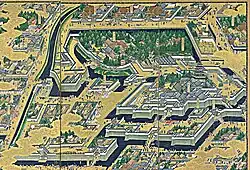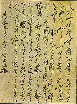 At Sunpu, he was treated fairly well as a potentially useful ally of the Imagawa clan until 1556 when he was 14 years old.[10] Yoshimoto decided that the Matsudaira clan's territory would be inherited by Takechiyo in the future, with the aim that the Imagawa clan could rule the area by extensions of their Matsudaira clan as their vassal, including Zuien-in (the daughter of Matsudaira Nobutada and Takechiyo's great-aunt), who was the only member of the Anjo Matsudaira clan left in Okazaki Castle.[13][14][e]