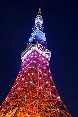 The tower was lit for the new millennium in 2000 with Motoko Ishii again reprising her role as the designer.[42] In December 2008, Nihon Denpatō spent $6.5 million to create a new night-time illumination scheme—titled the "Diamond Veil"—to celebrate the tower's 50th anniversary. The arrangement featured 276 lights in seven colors equally distributed across the towers four faces.[10]