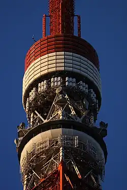 Tokyo Tower, a member of the World Federation of Great Towers, has been used by many organizations for broadcasting purposes. The structure was intended for broadcasting television, but radio antennas were installed in 1961 because it could accommodate them.[7] While analog and digital television broadcasts are no longer conducted from the site, two FM radio stations remain on Tokyo Tower. Stations that use or have used the tower's antenna include:[12]