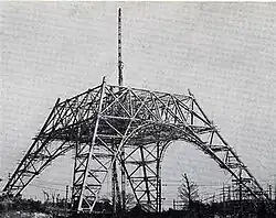 The new construction project attracted hundreds of tobi (鳶), traditional Japanese construction workers who specialized in the construction of high-rise structures. The Takenaka Corporation broke ground in June 1957 and each day at least 400 laborers worked on the tower.[5] It was constructed of steel, a third of which was scrap metal taken from US tanks damaged in the Korean War.[9][10] When the 90 m (300 ft)-long antenna was bolted into place on 14 October 1958, Tokyo Tower was the tallest freestanding tower in the world, taking the title from the Eiffel Tower by 9 m (30 ft).[11]