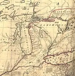 "Mitchell Map" of the region, from the late 18th century, used to create the Ordinance Line of 1787. The southern tip of Lake Michigan is depicted as being farther north than Lake Erie.