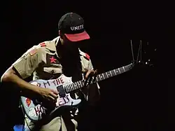Morello uses a number of often heavily-modified guitars from various manufacturers to create his "unconventionally iconic" guitar tone, and many of them feature slogans in homage to Woody Guthrie's "This Machine Kills Fascists" acoustic.[89][90][91] His most famous such guitar—which bears the painted text "Arm the Homeless"—was a Stratocaster-style custom shop build he commissioned before joining his first band in California.[92] Displeased with the result, Morello spent several years modifying it, repeatedly swapping pickups, necks, and bridges in a vain attempt to replicate the tones of Randy Rhoads and Nuno Bettencourt. Morello eventually abandoned this pursuit and chose to instead "take whatever sound this thing makes and I’m going to create with it."[92] He added "Arm the Homeless" text before a gig at the Whisky a Go Go because he liked the "provocative and militant situationist" slogan juxtaposed with smiling hippopotamus graphics he had previously added. The guitar is his main instrument for songs in standard tuning.[92]