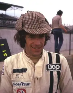 Pryce's Shadow teammate, Jean-Pierre Jarier, out-qualified him in the early part of the 1975 season, as the French driver had the new Shadow DN5 car, while Pryce was in the older DN3.[35] It was not until the third round, the South African Grand Prix, that Pryce was able to use a DN5.[36] The team's fourth race of the season was the non-championship Race of Champions held at Brands Hatch. Pryce qualified on pole position and, following a poor start, passed Peterson and Jacky Ickx before closing an eight-second gap to race leader Jody Scheckter, whose engine failed while Pryce harried him,[37] letting Pryce through to become the first Welshman to win a Formula One race.[38] Pryce showed other signs of promise during the season, most notably in Monaco and Silverstone where he qualified on the front row of the grid, the latter being in pole position.[39] Pryce also achieved his first World Championship podium finish, in extremely wet conditions at the Austrian Grand Prix and finished in the points four more times. The highest of those came in Germany where he finished fourth, despite the fact that while he was running second behind Carlos Reutemann fuel had been leaking into the cockpit of his DN5 during the final laps around the Nürburgring, reportedly "searing his skin and almost blinding him with fumes".[40] The Welshman later received the Prix Rouge et Blanc Jo Siffert award, named after the Swiss Formula One driver, for this achievement.[41]