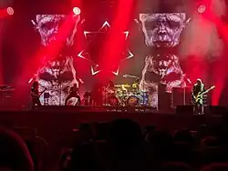 Live shows on Tool's headline tour incorporate an unorthodox stage setting and video display.[174] Keenan and Carey line up in the back on elevated platforms, while Jones and Chancellor stand in the front, toward the sides of the stage.[175] Keenan often faces the backdrop or the sides of the stage rather than the audience.[176][177][178][179] No followspots or live cameras are used;[180] instead, the band employs extensive backlighting to direct the focus away from the band members and toward large screens in the back and the crowd.[174] Breckinridge Haggerty, the band's live video designer, says that the resulting dark spaces on stage "are mostly for Maynard". He explains, "[a] lot of the songs are a personal journey for him and he has a hard time with the glare of the lights when he's trying to reproduce these emotions for the audience. He needs a bit of personal space, and he feels more comfortable in the shadows."[180] The big screens are used to play back "looped clips that aren't tracked to a song like a music video. The band has never used any sort of timecode. They’ve always made sure the video can change on-the-fly, in a way that can be improvised. ... The show is never the same twice."[180] During the 10,000 Days tour, the video material consisted of over six hours of material, created by Jones, his wife Camella Grace, Chet Zar, Meats Meier, and Haggerty.[180] Some of the material created by Zar has been released on his DVD Disturb the Normal.[181]