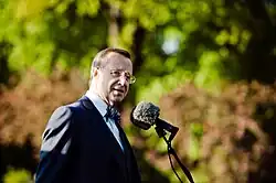 Ilves moved to the United States with his family and grew up in Leonia, New Jersey, and graduated from Leonia High School in 1972 as valedictorian.[8] He received a bachelor's degree in psychology from Columbia University in 1976 and a master's degree in the same subject from the University of Pennsylvania in 1978.[9] He also received an honorary degree from St. Olaf College in 2014 in recognition of his relationship with the college.[10] In addition to his native Estonian, Ilves also speaks English, German, Spanish and Latvian.[11] By Ilves's own admission, he speaks Estonian with a comparatively strong American accent, on account of spending his formative and young adult years in America and Germany.[12]