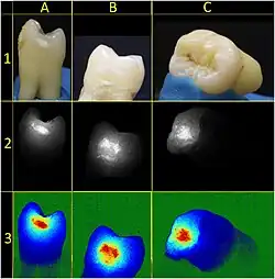 - ^ a b Deana AM, Jesus SH, Koshoji NH, Bussadori SK, Oliveira MT (2013). "Detection of early carious lesions using contrast enhancement with coherent light scattering (speckle imaging)". Laser Physics. 23 (7) 075607. Bibcode:2013LaPhy..23g5607D. doi:10.1088/1054-660x/23/7/075607. S2CID 121571950.