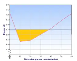 The frequency with which teeth are exposed to cariogenic (acidic) environments affects the likelihood of caries development. After meals or snacks, the bacteria in the mouth metabolize sugar, resulting in an acidic by-product that decreases pH. As time progresses, the pH returns to normal due to the buffering capacity of saliva and the dissolved mineral content of tooth surfaces. During every exposure to the acidic environment, portions of the inorganic mineral content at the surface of teeth dissolve and can remain dissolved for two hours.[33] Since teeth are vulnerable during these acidic periods, the development of dental caries relies heavily on the frequency of acid exposure.