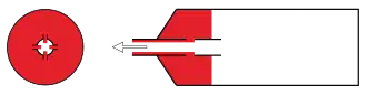 Marraffino's design, which remains in use for single-color stripes, is simple. The main material, usually white, sits at the crimp end of the toothpaste tube and makes up most of its bulk. A thin pipe, through which that carrier material will flow, descends from the nozzle to it. The stripe-material (this was red in Stripe) fills the gap between the carrier material and the top of the tube. The two materials are not in separate compartments, but they are sufficiently viscous that they will not mix. When pressure is applied to the toothpaste tube, the main material squeezes down the thin pipe to the nozzle. Simultaneously, the pressure applied to the main material causes pressure to be forwarded to the stripe material, which thereby issues out through small holes (in the side of the pipe) onto the main carrier material as it is passing those holes.