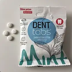 Toothpaste is a paste or gel dentifrice that is used with a toothbrush to clean and maintain the aesthetics of teeth. Toothpaste is used to promote oral hygiene: it is an abrasive that aids in removing dental plaque and food from the teeth, assists in suppressing halitosis, and delivers active ingredients (most commonly fluoride) to help prevent tooth decay (dental caries) and gum disease (gingivitis).[1] Due to variations in composition and fluoride content, not all toothpastes are equally effective in maintaining oral health. The decline of tooth decay during the 20th century has been attributed to the introduction and regular use of fluoride-containing toothpastes worldwide.[2][3] Large amounts of swallowed toothpaste can be poisonous.[4] Common colors for toothpaste include white (sometimes with colored stripes or green tint) and blue.