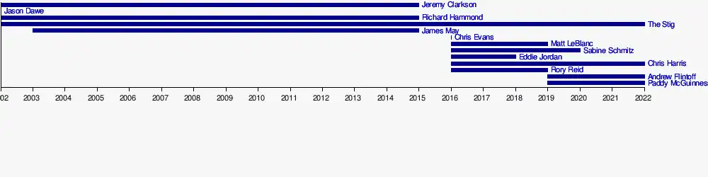 The programme's first series in 2002 was presented by Clarkson, Richard Hammond, and Jason Dawe, with an anonymous test driver "The Stig" also being featured. Wilman was the show's executive producer. Following the first series, Dawe was replaced by James May, with the line-up unchanged until the end of the twenty-second series, when the BBC chose to not renew Clarkson's contract in March 2015, following an incident during filming.[6] His dismissal from Top Gear prompted the departure of Hammond, May and Wilman from the programme,[1][7][8] who joined Clarkson on a new motoring series for Amazon, The Grand Tour.[9]