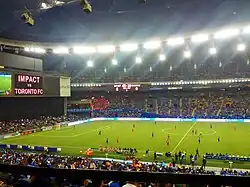 Expansion to the north end that cost $2 million, added 1,249 seats and was completed for the start of the 2010 MLS Season.[111] A$120 million renovation to the stadium was officially announced September 23, 2014. It included a second tier of seating that added 8,400 seats, raising the capacity of the stadium to 30,991. New suites, washrooms, concourse and a roof were added. Construction began in September 2014 and would be divided into two phases; the completion of the project was set for May 2016.[112] The expansion would accommodate a Canadian football field with artificial turf end-zones when the Toronto Argonauts move to BMO Field in 2016,[113][114] along with hosting the Grey Cup that year.