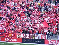 Toronto FC's recognized supporters' groups are the Red Patch Boys, U-Sector, Kings in the North, Tribal Rhythm Nation and Original 109.[122] On August 23, 2018, Toronto FC permanently terminated Inebriatti's supporter status for a fire they started at TD Place Stadium in Ottawa during their match-up with Toronto FC in the Canadian Championship earlier that year on July 18.[123]