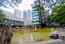 Most of the parks, plazas, and green spaces on the university's campus are owned by the university, although access to these spaces is also open to the public.[41] These spaces include Devonian Square, and Kerr Hall's quadrangle.[47] Devonian Square was designed by Toronto Parks, Forestry and Recreation Division, and was partly funded by the Devonian Group of Charitable Foundations of Calgary—who also lent the park its name.[47] The space features a reflecting pool, and large Precambrian igneous and metamorphic rocks that are approximately two billion years old from the Canadian Shield.[48] In addition to green spaces, a green roof and urban farm, initially known as the Andrew and Valerie Pringle Environmental Green Roof, was built atop George Vari Engineering and Computing Centre in 2003.[49] The urban farm operates on a five-year crop rotation, and contains 30 different crops and hundreds of cultivars.[49]