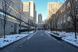 The university's central campus primarily lies within the Garden District of downtown Toronto. The campus is "interwoven" with the rest of the downtown core, with few entrance markers delineating the campus from the rest of the city.[35] Most of the campus is designated as a mixed-use institutional area, although portions of the campus are situated in areas zoned for commercial and residential use.[36] In addition to zoning by-laws, the height of the university's buildings is also limited by ordinances that protect the flight paths of air medical services to St. Michael's Hospital and the Hospital for Sick Children.[37]