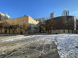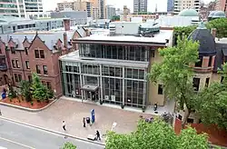 The university operates more than 40 buildings.[52] As of 2019, the university's buildings account for over 370,000 square metres (4,000,000 sq ft) of gross floor area.[53] The campus includes an assortment of buildings from different architectural periods; Oakham House dating back to 1848, and the university's newest building, the Daphne Cockwell Health Sciences Complex, opened in 2019.[54][55] Many of the earliest buildings built specifically for use by the university were designed during the mid-20th century in a Brutalist architectural-style.[56] The university campus saw significant expansion during the early 21st century, with the university's total floor area nearly doubling in size from 2000 to 2019.[53]