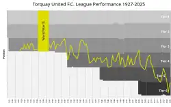 Capitalizing on this momentum, the club once again applied for league membership and were successful this time, joining the Football League Third Division. The town of Torquay had had joined Plymouth and Exeter in the football league at last. Torquay's first match in the league took place on 27 August 1927, a crowd of 11,625 watched a 1–1 draw. The team's first season in the league however, was not a success, finishing their first season in the football league bottom of the table on 30 points and with a goals against tally of 103.[5] Though they were successfully re-elected to the league for the next season. Throughout the 1930s, Torquay struggled against financial problems, they also failed to finish higher than 10th in twelve seasons. When league football was resumed in 1946 after the Second World War, United continued to struggle and finished that season 19th.
