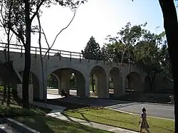 Public transportation played a key role in the founding of Torrance. The Pacific Electric Red Car connected downtown Los Angeles to the new development of downtown Torrance. Designed in 1912 by Irving Gill, the terminus depot of the Red Car line was designed in a Spanish revival style popularized during this era.[18] In May 1913, the Pacific Electric Railroad Bridge was built. Often called the "El Prado Bridge", it further expanded the industrial heart of the South Bay. The concrete double-tracked arch bridge was the Pacific Electric Railway's first interurban line that connected north–south to San Pedro via the Gardena Line.[19] The bridge was used for transporting freight and commuting workers to Torrance factories. The Red Car line connected under the bridge as it connected to the train depot located on Cabrillo Avenue. The bridge no longer carries any rail cars, with Pacific Electric closing the Red Car line to Torrance in the 1940s. The bridge became the city of Torrance's second entry in the National Register of Historic Places on July 13, 1989, and is used as a logo for the city's new wayfinding signage and city materials.[20]
