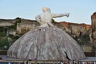 Among non-traditional productions, Luca Ronconi, in 1996 at La Scala, used distorted and fractured scenery to represent the twists of fate reflected in the plot.[52] Jonathan Miller, in a 1986 production for the 49th Maggio Musicale Fiorentino, transferred the action to Nazi-occupied Rome in 1944, with Scarpia as head of the fascist police.[56] In Philipp Himmelmann's production on the Lake Stage at the Bregenz Festival in 2007 the act 1 set, designed by Johannes Leiacker, was dominated by a huge Orwellian "Big Brother" eye. The iris opens and closes to reveal surreal scenes beyond the action. This production updates the story to a modern Mafia scenario, with special effects "worthy of a Bond film".[57]