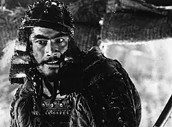 Vastly talented, charismatic, and imposing (because of his strong voice and physique), the star of most of Akira Kurosawa's classics became the first Japanese actor since Sessue Hayakawa to have international fame. But where Hayakawa became a sex symbol because he was romantic, exotic, and suavely charming (even when playing lecherous villains), Mifune's sex appeal – and appeal to male viewers – was due to his sheer unrefined and uninhibited masculinity. He was attractive even when he was unshaven and unwashed, drunk, wide-eyed, and openly scratching himself all over his sweaty body, as if he were a flea-infested dog. He did indeed have animal magnetism – in fact, he based his wild, growling, scratching, superhyper Samurai recruit in The Seven Samurai on a lion. It shouldn't be forgotten that Mifune was terrific in Kurosawa's contemporary social dramas, as detectives or doctors, wearing suits and ties, but he will always be remembered for his violent and fearless, funny, morally ambivalent samurai heroes for Kurosawa, as well as in Hiroshi Inagaki's classic epic, The Samurai Trilogy.[47]