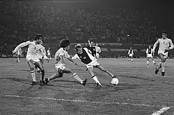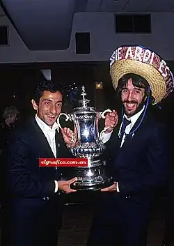 Spurs went into a period of decline after the successes of the early 1970s, and Nicholson resigned after a poor start to the 1974–75 season.[40] The team was then relegated at the end of the 1976–77 season with Keith Burkinshaw as manager. Burkinshaw quickly returned the club to the top flight, building a team that included Glenn Hoddle as well as two Argentinians, Osvaldo Ardiles and Ricardo Villa, which was unusual as players from outside the British Isles were rare at that time.[41] The team that Burkinshaw rebuilt went on to win the FA Cup in 1981 and 1982[42] and the UEFA Cup in 1984.[43]