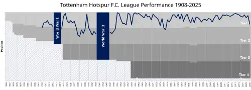 In 1908, the club was elected into the Football League Second Division and won promotion to the First Division in their first season, finishing runners-up. In 1912, Peter McWilliam became manager; Tottenham finished bottom of the league at the end of the 1914–15 season when football was suspended due to the First World War. Spurs were relegated to the Second Division on the resumption of league football after the war, but quickly returned to the First Division as Second Division champions of the 1919–20 season.[22]