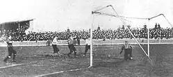 As they played on public parkland, the club could not charge admission fees and, while the number of spectators grew to a few thousand, it yielded no gate receipts. In 1888, the club rented a pitch between numbers 69 and 75 Northumberland Park[77] at a cost of £17 per annum, where spectators were charged 3d a game, raised to 6d for cup ties.[78] The first game at the Park was played on 13 October 1888, a reserve match that yielded gate receipts of 17 shillings. The first stand with just over 100 seats and changing rooms underneath was built at the ground for the 1894–95 season at a cost of £60. However, the stand was blown down a few weeks later and had to be repaired.[79] In April 1898, 14,000 fans turned up to watch Spurs play Woolwich Arsenal. Spectators climbed on the roof of the refreshment stand for a better view of the match. The stand collapsed, causing a few injuries. As Northumberland Park could no longer cope with the larger crowds, Spurs looked for a larger ground and moved to the White Hart Lane site in 1899.[80]
