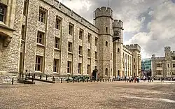 As a result of Henry's expansion, St Peter ad Vincula, a Norman chapel which had previously stood outside the Tower, was incorporated into the castle. Henry decorated the chapel by adding glazed windows, and stalls for himself and his queen.[31] It was rebuilt by Edward I at a cost of over £300[36] and again by Henry VIII in 1519; the current building dates from this period, although the chapel was refurbished in the 19th century.[37] Immediately west of Wakefield Tower, the Bloody Tower was built at the same time as the inner ward's curtain wall, and as a water-gate provided access to the castle from the River Thames. It was a simple structure, protected by a portcullis and gate.[38] The Bloody Tower acquired its name in the 16th century, as it was believed to be the site of the murder of the Princes in the Tower.[39] Between 1339 and 1341, a gatehouse was built into the curtain wall between Bell and Salt Towers.[40] During the Tudor period, a range of buildings for the storage of munitions was built along the inside of the north inner ward.[41] The castle buildings were remodelled during the Stuart period, mostly under the auspices of the Office of Ordnance. In 1663, just over £4,000 was spent building a new storehouse (now known as the New Armouries) in the inner ward.[42] Construction of the Grand Storehouse north of the White Tower began in 1688, on the same site as the dilapidated Tudor range of storehouses;[43] it was destroyed by fire in 1841. The Waterloo Block, a former barracks in the castellated Gothic Revival style with Domestic Tudor details,[44] was built on the site and remains to this day, housing the Crown Jewels on the ground floor.[45]