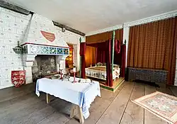 The tower was terraced into the side of a mound, so the northern side of the basement is partially below ground level.[17] As was typical of most keeps,[18] the bottom floor was an undercroft used for storage. One of the rooms contained a well. Although the layout has remained the same since the tower's construction, the interior of the basement dates mostly from the 18th century when the floor was lowered and the pre-existing timber vaults were replaced with brick counterparts.[17] The basement is lit through small slits.[13]
