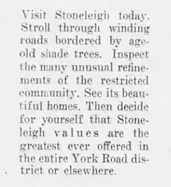 A February 13, 1927 advertisement in the Baltimore Sun for racially restricted houses in the Stoneleigh section of Towson.