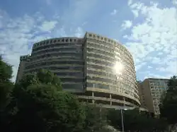 The Baltimore County Courthouse, still in use by 2015, with its various annexes (and the separate county courts and administrative building), was originally designed by the local city architectural firm of Dixon, Balbirnie and Dixon.[16] It was completed within a year, constructed of limestone and marble donated by the well-known Ridgely family of nearby Hampton Mansion, on land donated by Towson doctor Grafton Marsh Bosley.[9][12][15] The courthouse was subsequently enlarged in 1910 through additional designs for north and south wings by well-known and regarded city architects, Baldwin & Pennington. Additional expansions later in 1926 and 1958 eventually created an H-shaped plan for the courthouse. An additional modernistic Baltimore County Courts Building, with room for the new charter government since 1956 and administration of a county executive and county council, plus administrative and executive departments, was erected in 1970–71 across a plaza to the west of the older historic courthouse.[17]