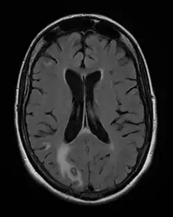 Toxoplasmosis in humans is diagnosed through biological, serological, histological, or molecular methods, or by some combination of the above.[63] Toxoplasmosis can be difficult to distinguish from several other conditions, especially ones that are common in HIV/AIDS and immunocompromised patients, and can cause central nervous system problems and brain lesions.[69] Toxoplasmosis is most commonly mistaken for primary central nervous system lymphoma, both conditions cause lesions in the brain, but in about 50-80% of cases the lesions appearances can be very similar on imaging, and exist in an area of the brain that makes biopsying too risky, however the main difference is lymphoma typically causes a single lesion in the subependymal region, and toxoplasmosis causes multiple lesions scattered through the basal ganglia.[70] Other conditions that can present as toxoplasmosis on a differential diagnosis are metastatic brain lesions, progressive multifocal leukoencephalopathy,[71] CNS tuberculosis,[72] bacterial or fungal brain abscess, cytomegalovirus (CMV),[73] and herpes simplex encephalitis.[69][74]