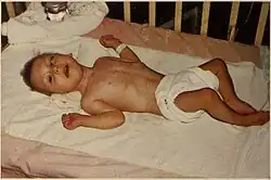 While rare, skin lesions may occur in the acquired form of the disease, including roseola and erythema multiforme-like eruptions, prurigo-like nodules, urticaria, and maculopapular lesions. Newborns may have punctate macules, ecchymoses, or "blueberry muffin" lesions.