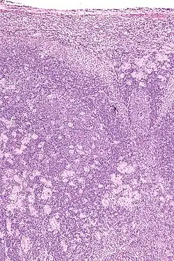 Acute toxoplasmosis is often asymptomatic in healthy adults.[14][15] However, symptoms may manifest and are often influenza-like: swollen lymph nodes, headaches, fever, and fatigue,[16] or muscle aches and pains that last for a month or more. It is rare for a human with a fully functioning immune system to develop severe symptoms following infection. People with weakened immune systems are likely to experience headache, confusion, poor coordination, seizures, lung problems that may resemble tuberculosis or Pneumocystis jirovecii pneumonia (a common opportunistic infection that occurs in people with AIDS), or chorioretinitis caused by severe inflammation of the retina (ocular toxoplasmosis).[16] Young children and immunocompromised people, such as those with HIV/AIDS, those taking certain types of chemotherapy, or those who have recently received an organ transplant, may develop severe toxoplasmosis. This can cause damage to the brain (encephalitis) or the eyes (necrotizing retinochoroiditis).[17] Infants infected via placental transmission may be born with either of these problems, or with nasal malformations, although these complications are rare in newborns. The toxoplasmic trophozoites causing acute toxoplasmosis are referred to as tachyzoites, and are typically found in various tissues and body fluids, but rarely in blood or cerebrospinal fluid.[18]