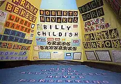 She studied fashion at Medway College of Design (now part of the University for the Creative Arts) (1980–82).[29][30] There she met expelled student Billy Childish and was associated with The Medway Poets.[31] Emin and Childish were a couple until 1987, during which time she was the administrator for his small press, Hangman Books, which published his confessional poetry.[31] From 1983–86[23] she studied printmaking at Maidstone Art College (now part of the University for the Creative Arts) where graduated with a first class degree in Printmaking[32][33] . Also, whilst at Maidstone college of Art, Tracey Emin encountered Roberto Navickas aka Roberto Navikas, a name which was later to feature prominently in her "tent". Emin however, mistakenly misspelled his name by dropping a C. Navickas used this error to promote two artworks of his own, some twenty odd years later when re-entering the art world. The works were titled "The Lost C of Emin: The Discovery" & "The Lost C of Emin: A Reliquary" (see tent below).[34]