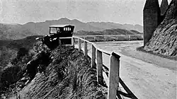A potential long fall stopped by an early guardrail, c. 1920. Guardrails, median barriers, or other physical objects can help reduce the consequences of a collision, or minimize damage.